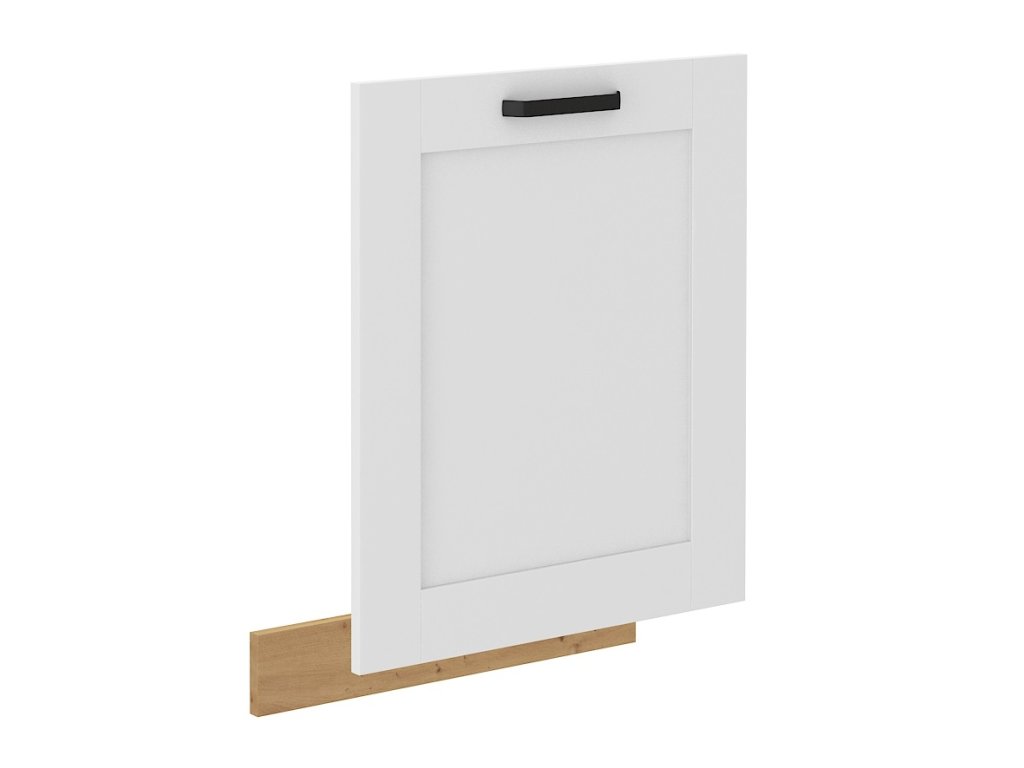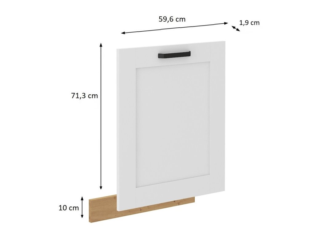 Dveře pro vestavnou myčku bez ovládacího panelu o šířce 60 cm z kuchyňského systému LUNA BÍLÁ / DUB ARTISAN mají rozměr 59,6x71,3x1,9 cm. Jsou vyrobeny z kvalitní MDF desky v matném bílém provedení a doplněny o sokl výšky 10 cm v barvě DUB ARTISAN, který ladí s kuchyňskou linkou ve stylu Provence.