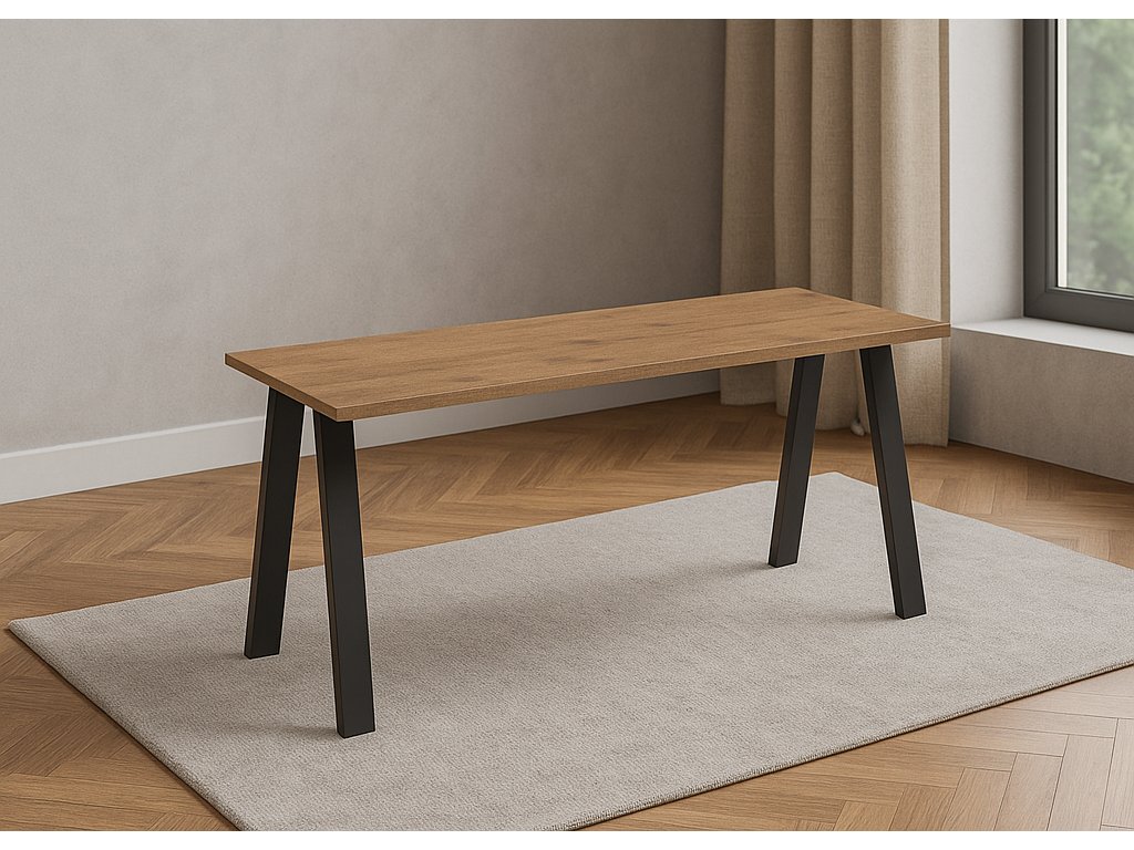 Jídelní stůl KLEO je harmonickým spojením funkčnosti, odolnosti a moderní estetiky. Jeho štíhlá, ale pevná konstrukce zaujme na první pohled a přirozeně vynikne zejména v moderních či industriálně laděných interiérech.