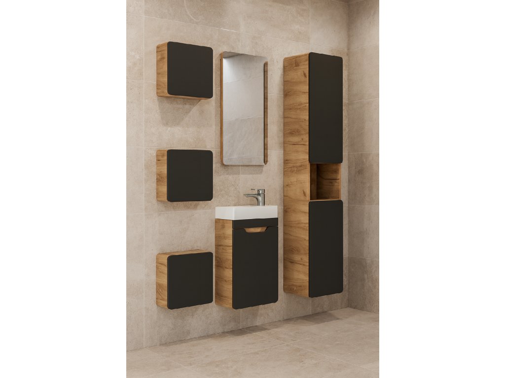 Kolekce koupelnového nábytku ARUBA COSMOS přináší do vaší koupelny dokonalou kombinaci přírodního designu a současných trendů. Korpus v dekoru dub Wotan v harmonii s čely v barvě Kosmos šedá (tmavý mat grafit) vytváří elegantní a sofistikovaný celek, který dodává interiéru moderní nádech s přírodním akcentem.