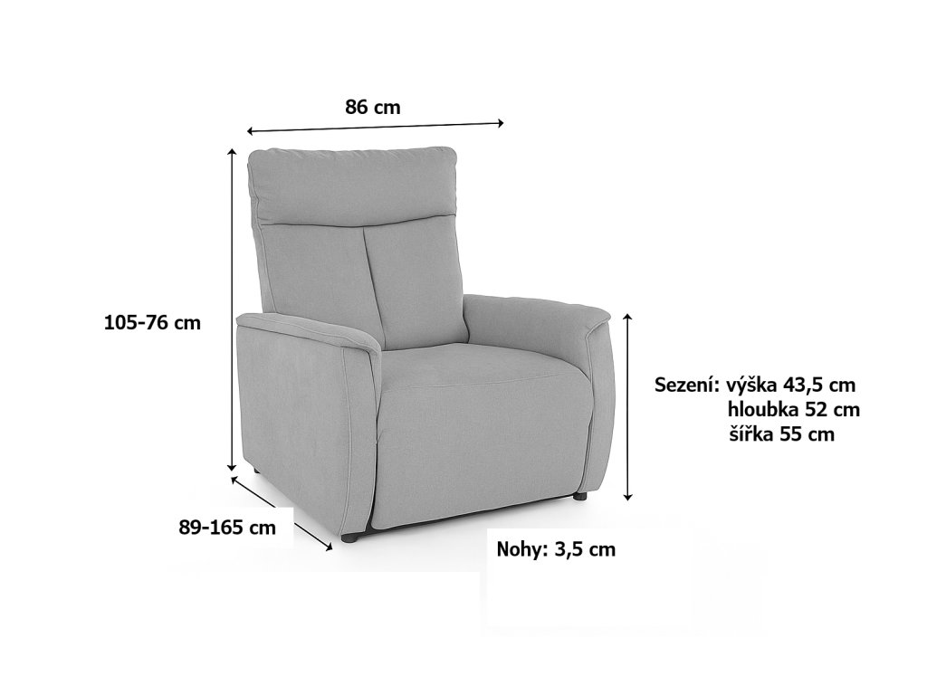 Křeslo je vybaveno manuálním polohovacím mechanismem, který umožňuje snadno a plynule nastavit polohu zad a nohou podle vašich aktuálních potřeb – ať už si chcete jen odpočinout, nebo si dopřát plnohodnotnou relaxaci v poloze vleže. Polohování se provádí jednoduchým tlakem těla, bez potřeby elektřiny či složité manipulace.