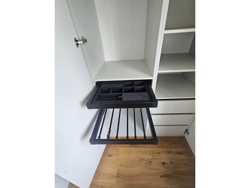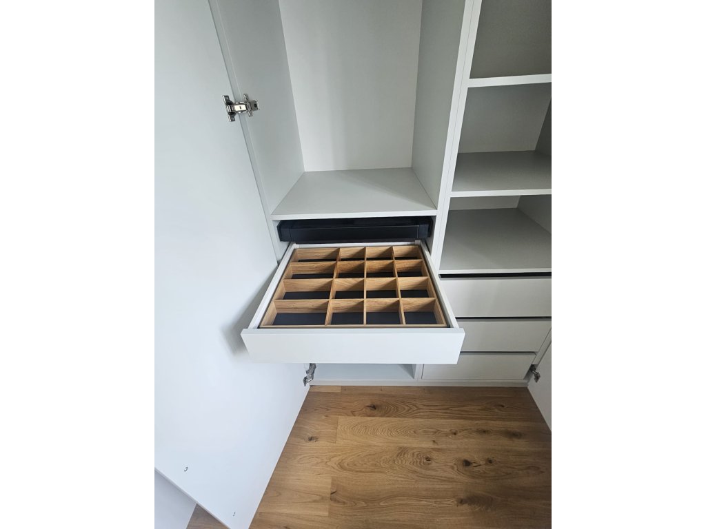 Každý den začíná pohodlněji, když máte vše přehledně uspořádané a snadno dostupné. Už žádné zbytečné hledání nebo kompromisy. Díky preciznímu truhlářskému zpracování a použití kvalitních materiálů máte jistotu, že vám naše vestavěná skříň na míru vydrží dlouhá léta a stane se spolehlivým partnerem vašeho života.