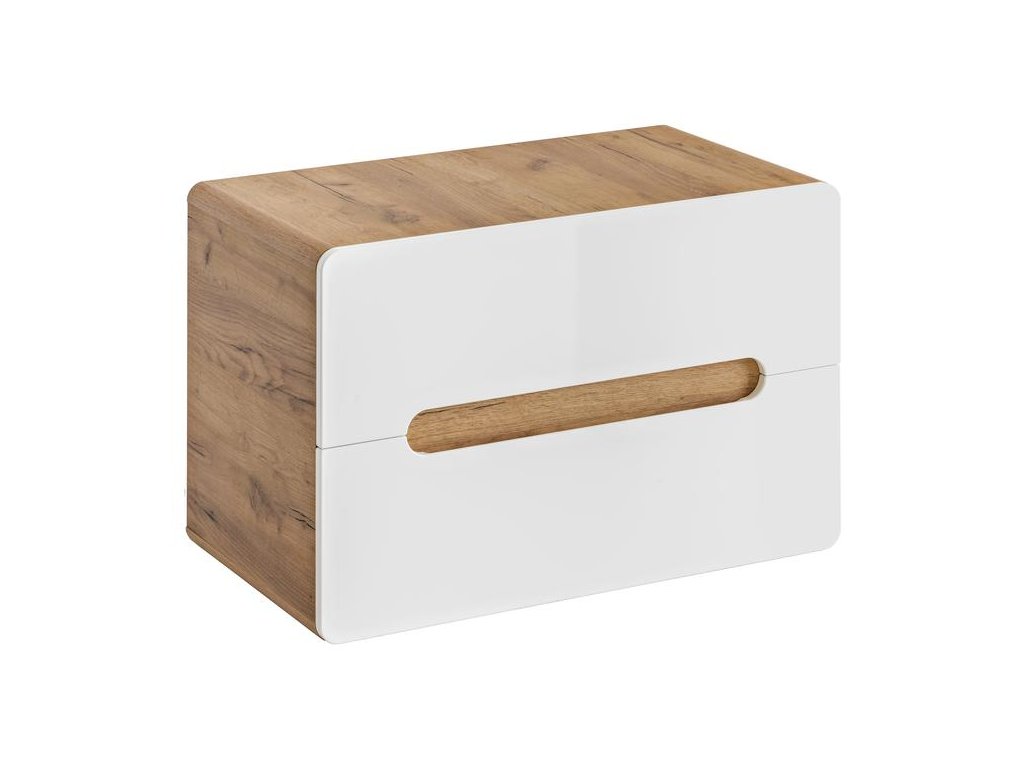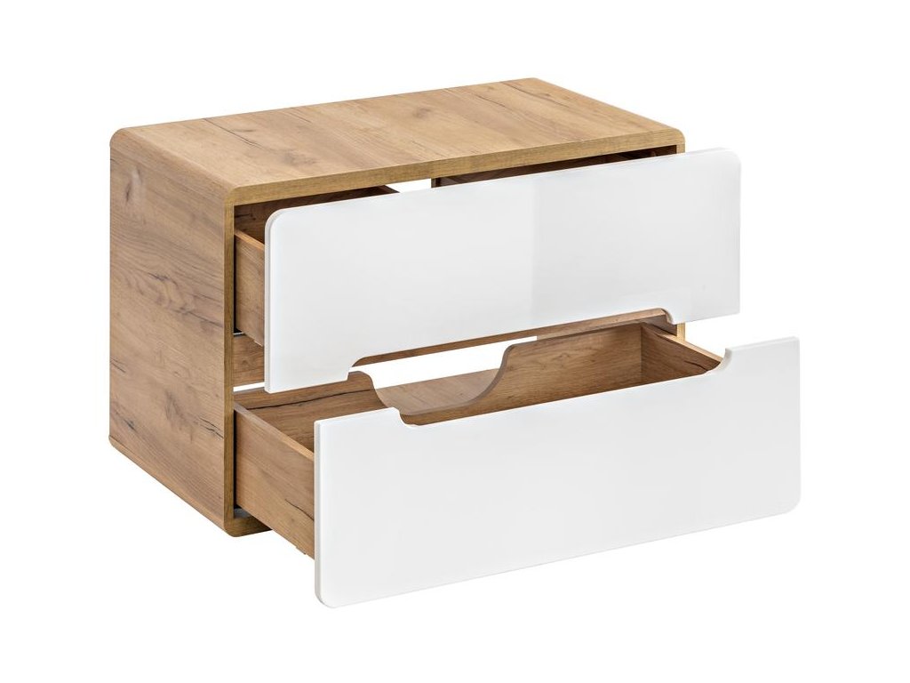 Díky dvěma prostorným zásuvkám poskytuje dostatek úložného místa pro všechny koupelnové potřeby. Zaoblené hrany dodávají skříňce jedinečný vzhled, zatímco bezúchytové otevírání podtrhuje její nadčasovou eleganci. Kovové pojezdy s funkcí tichého dovírání (Soft Close) pak zajišťují maximální komfort při každodenním používání.